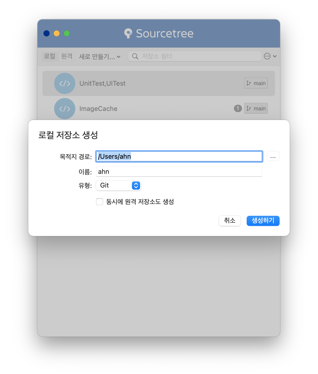로컬 저장소 생성을 누른다.