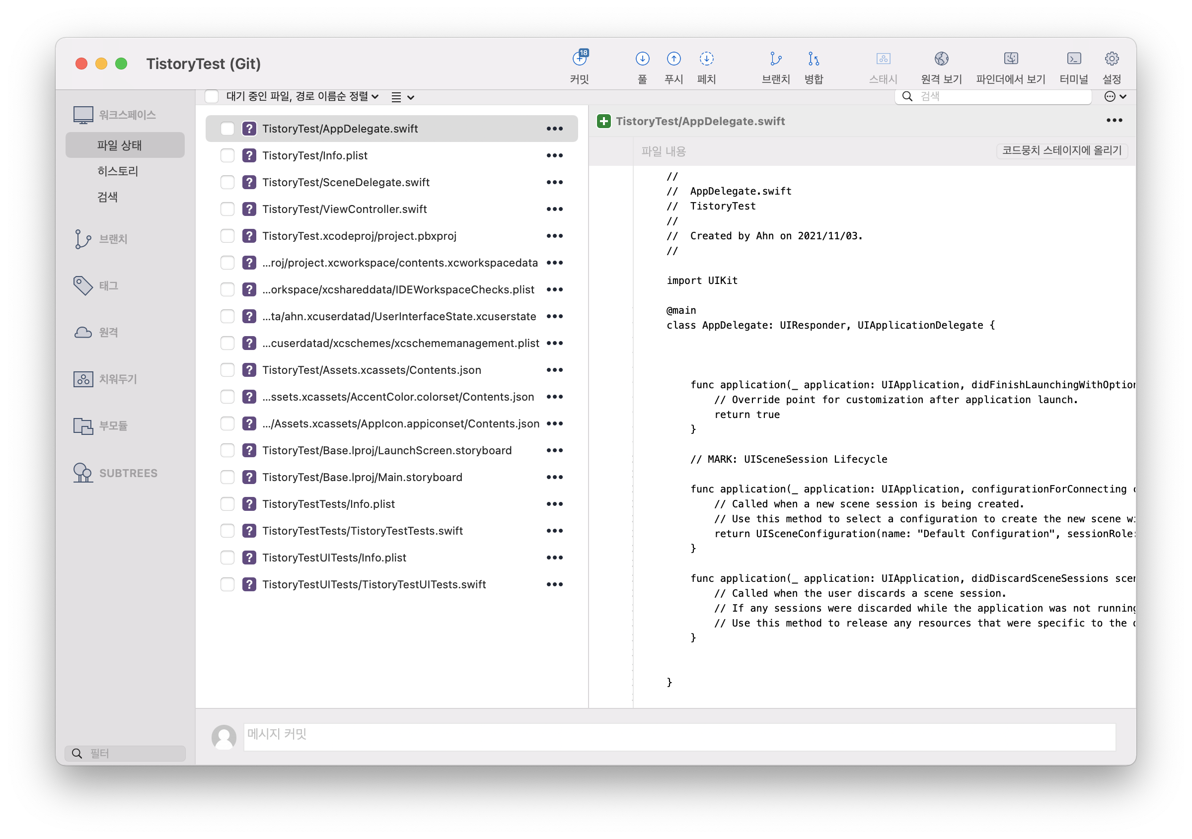 Master 브랜치는 즉 현재 Xcode Project에는 ReadMe 파일이 없다.