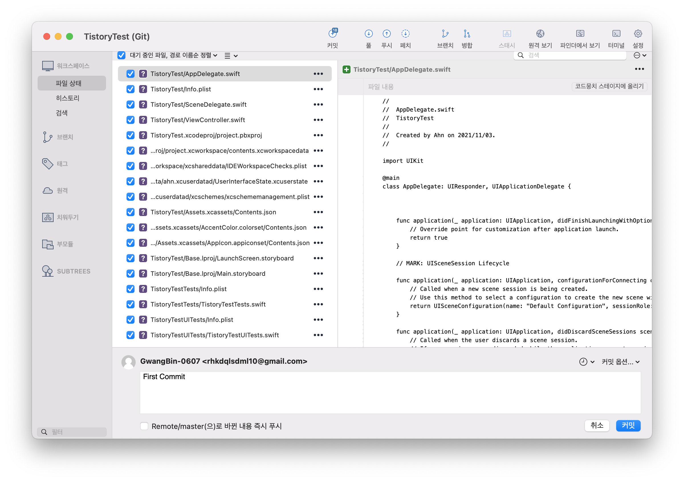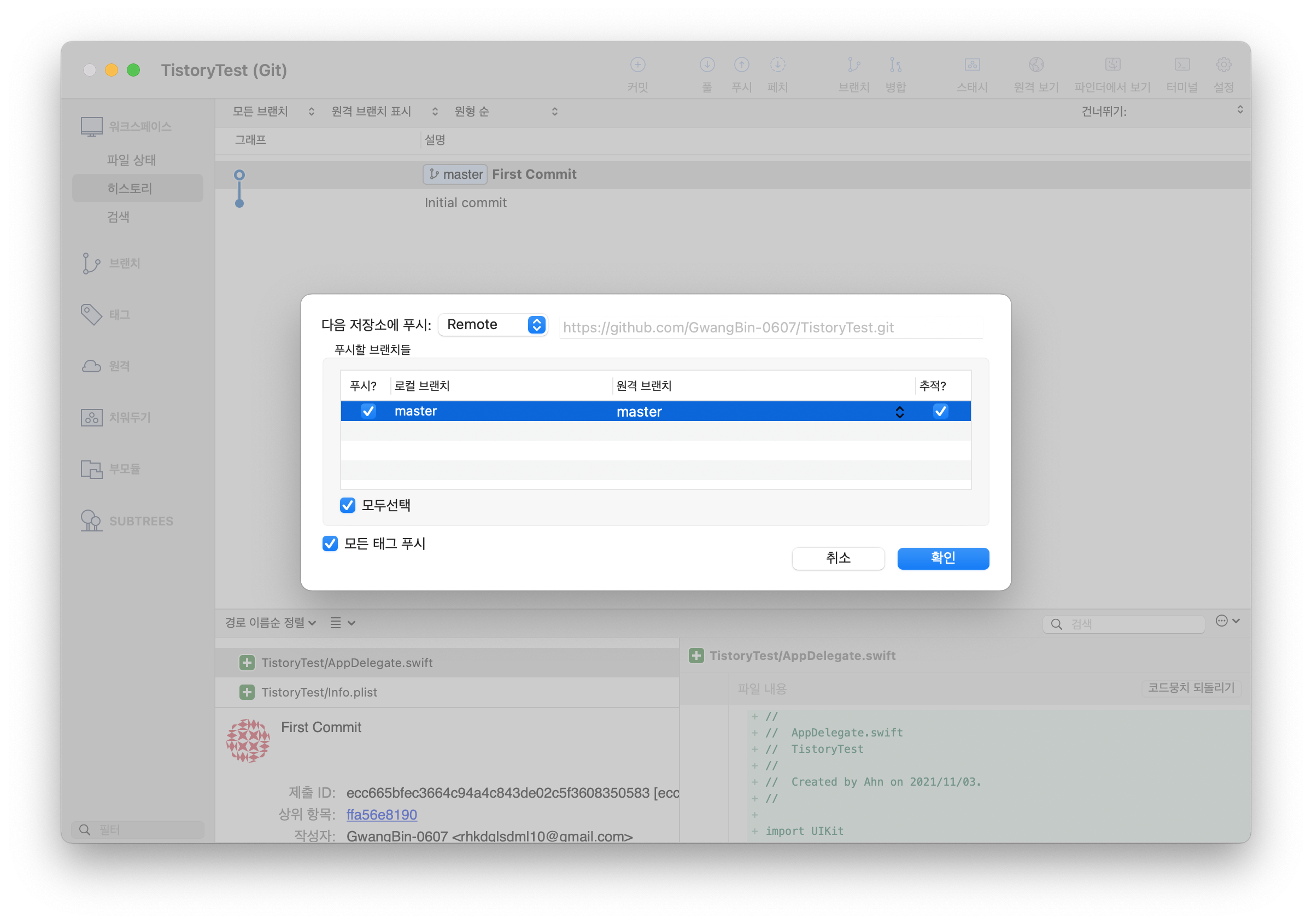 현재 커밋을 하는 Source Tree의 브랜치는 Master이다.