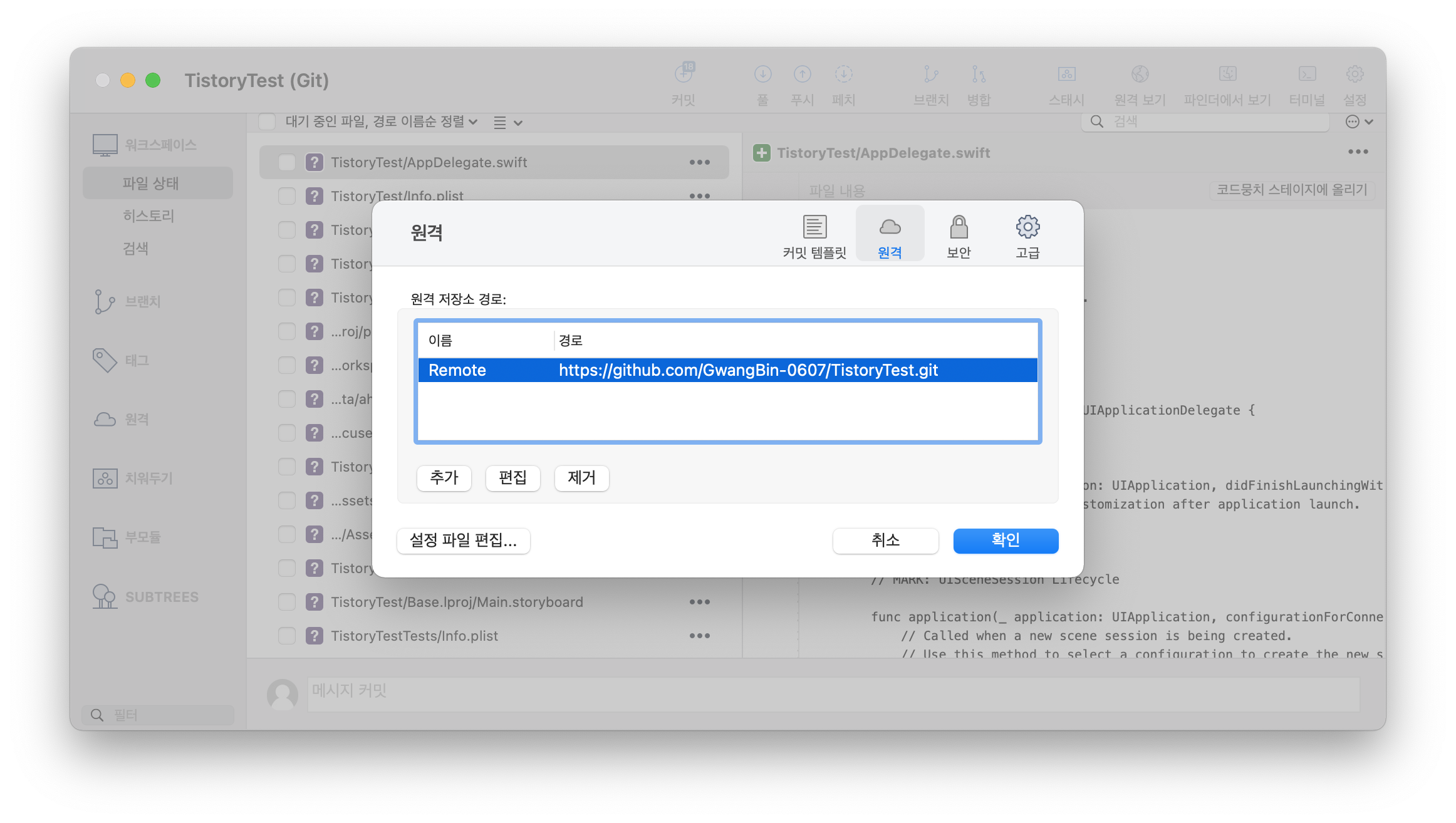 연동이 성공적으로 된다면 '원격' 리스트에 Private 저장소가 보일 것이다.