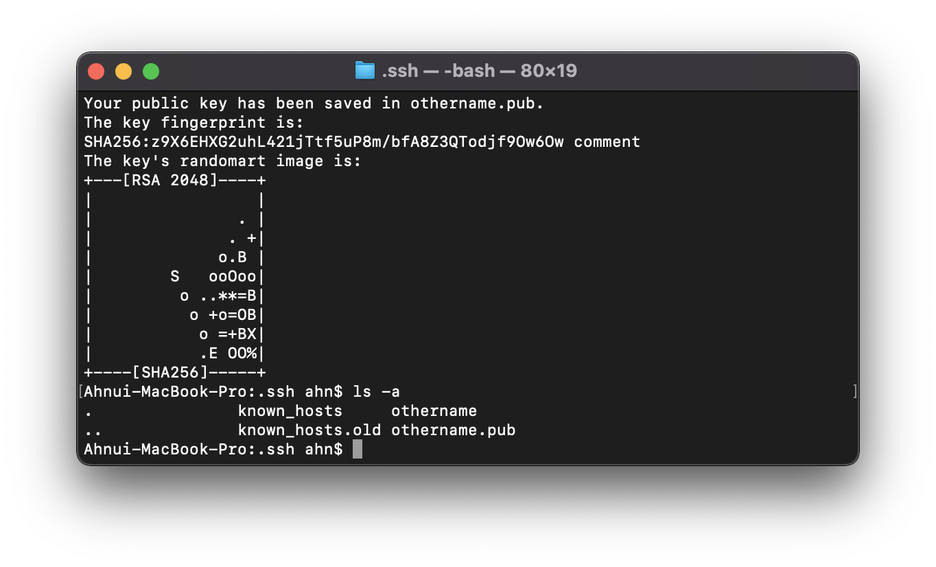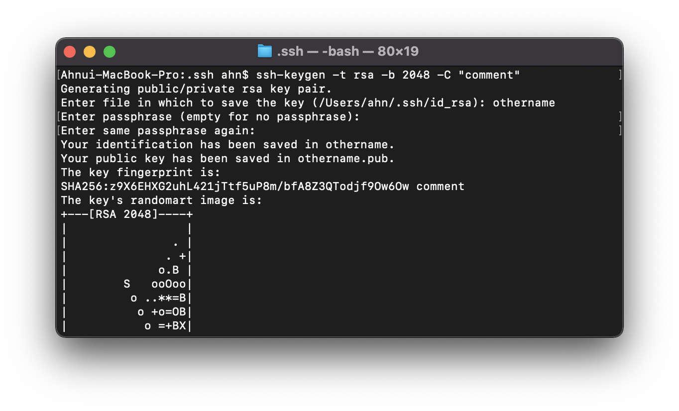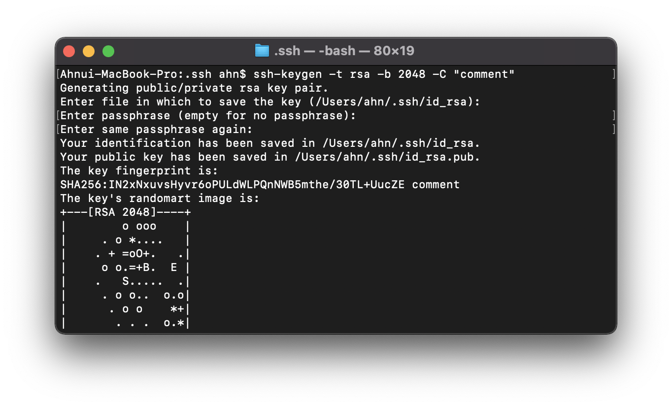 - Enter file in which to save the key (/Users/ahn/.ssh/id_rsa): -> Public Key,Private Key 파일의 이름을 id_rsa로 할 것인지 묻는 문구이다.파일 이름을 바꿀거면 파일이름을 입력하고 아니면 그냥 엔터만 입력한다.