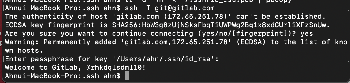 - Warning: Permanently added 'gitlab.com,172.65.251.78' (ECDSA) to the list of known hosts. -> known-hosts에 등록 되었다는 문구.